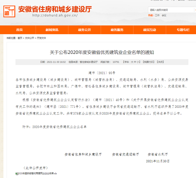 近日,安徽省住建廳傳來喜訊,2021年度安徽省優(yōu)秀建筑業(yè)企業(yè)評選結果已出爐,黃山市建工集團榮獲2020年度安徽省優(yōu)秀建筑業(yè)企業(yè)---建筑工程施工總承包類優(yōu)秀建筑業(yè)企業(yè)。