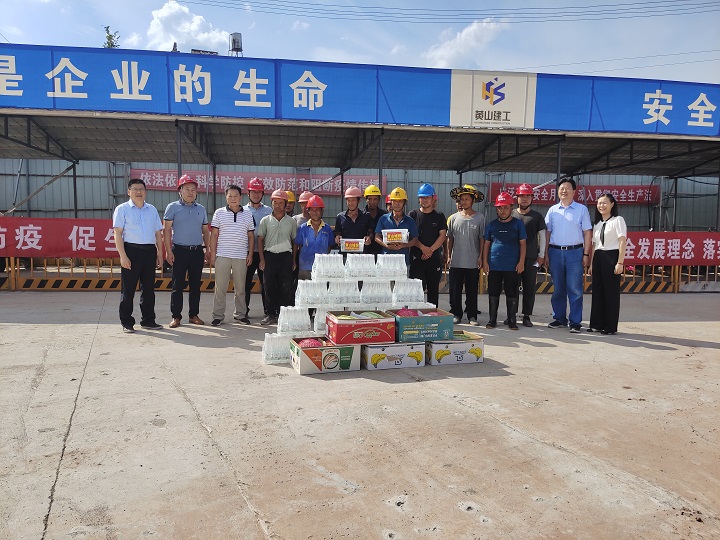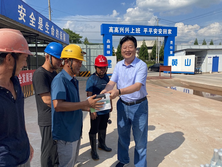 7月21上午,業(yè)主單位黃山市城投集團黨委書記、董事長陳杰、總裁黃世穩(wěn)等一行分組帶隊到我公司承建的黃山市危險(含醫(yī)療)廢物集中處置中心易地重建工程、黃山市南部城鎮(zhèn)群水務(wù)調(diào)度中心項目、黃山生豬定點屠宰加工及配套設(shè)施項目及配套冷鏈項目施工現(xiàn)場送來了人丹、十滴水、礦泉水、西瓜等防暑降溫用品,并向奮戰(zhàn)在一線的施工人員及項目部管理人員表示了親切的慰問和感謝,對一線人員頭頂烈日不畏酷暑的精神給予了贊揚。