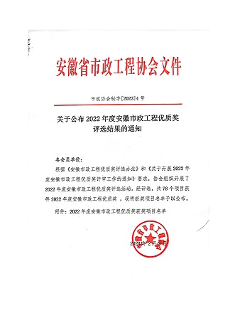 根據(jù)《安徽市政工程優(yōu)質(zhì)獎評選辦法》和《關于開展2022年度安徽市政工程優(yōu)質(zhì)獎評審工作的通知》要求,安徽省市政工程協(xié)會組織開展了2022年度安徽市政工程優(yōu)質(zhì)獎評選活動。黃山市建工集團股份有限公司承建的黟縣五里轉(zhuǎn)盤至開發(fā)區(qū)段道路及雨污管網(wǎng)升級改造項目榮獲2022年度安徽市政工程優(yōu)質(zhì)獎。