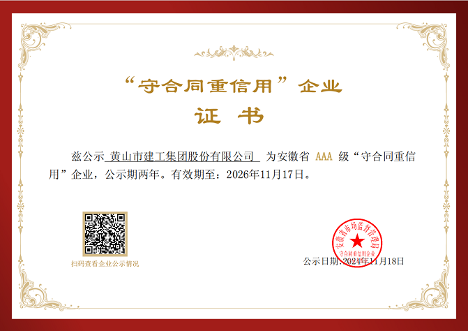 近日,黃山建工集團(tuán)憑借健全的信用管理體系、優(yōu)良的合同履約信用狀況和良好的市場(chǎng)信譽(yù)榮獲安徽省AAA級(jí)“守合同重信用”企業(yè)稱號(hào)。這一榮譽(yù)的獲得,不僅是對(duì)黃山建工集團(tuán)在企業(yè)經(jīng)營(yíng)過程中始終堅(jiān)持誠(chéng)信經(jīng)營(yíng)的肯定,也是對(duì)黃山建工集團(tuán)在合同履行和信用管理方面所取得的顯著成績(jī)的認(rèn)可。